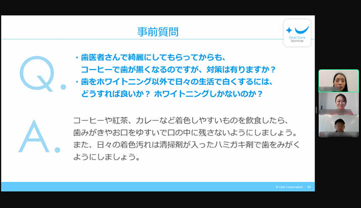 セミナー内容は実施前に募集した質問を踏まえてアレンジいただけたので、日頃の疑問を解消できたり、歯の健康の重要性を再認識できたり、有意義な時間だったと感じている参加者が多かったです。事後アンケートの満足度も高く、「セミナーで学んだハブラシの持ち方を意識したい」という前向きなコメントもあり、行動変容につながる施策になったと感じています。